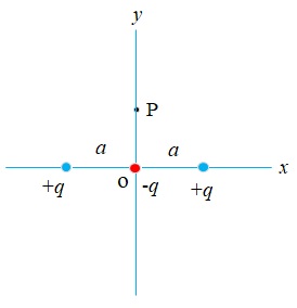 Two positive point charges q each are fixed respectively at x = a and x = – a on the x-axis, while a negative point charge – q is placed at the origin. P is a movable point on the y-axis.  Express the electric potential of the system of charges as a function of y and determine the point where the electric potential is zero.